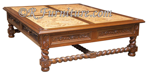 Italian Renaissance style, Italianate Coffee Table with hand carved leather panels. Santa Barbara coffee table, 64" x 52" x 18"H. 4 drawers, custom sizes available. Italian revival style.