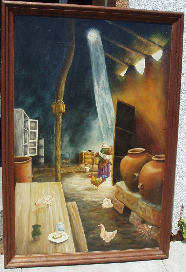 Hand painted on wood panel. Roosters in Peruvian barn. 35"W x 52"H